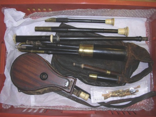 The Bag 970/6D is, I contend, a rare instrument transportation device, and its specific connection with bagpipes – Union Pipes in particular – and unique home-made construction means that it has significant historical value. Perhaps it once belonged to a ‘Toun Piper’, a possibility well worth investigating. This is a curiosity of local interest that brings with it images of remote Highland village halls, brightly lit and full of happy folk dancing, not to the skirl of the Highland Bagpipes, but to the rich tones of the Union Pipes. Similar instruments were played concurrently in the theatres of eighteenth-century London, possibly in other English towns and in Ireland, where it evolved into the now familiar Uilleann Pipes. The Bag, the bagpipe and their story should surely be on display to the public, not languishing unknown in the museum’s store.