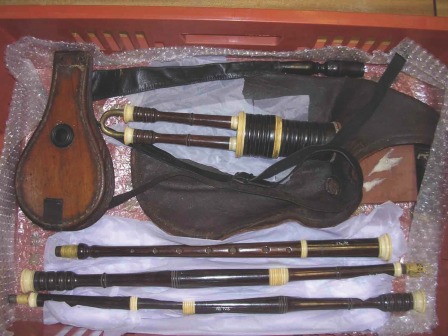Inverness Museum & Art Gallery has a fine collection of bagpipes the importance of which, I suspect, is generally underestimated. There are Highland Pipes, Scottish Smallpipes and Union Pipes, some complete and others fragmentary. Among the oddments are the three bagless, chanterless drones that so intriguingly resemble those on Geordie Syme’s bagpipe (see Chanter, Winter 2003, 12-13). The Union Bagpipes interested me most when I examined the collection of items not on display, because of the quality of the Inverness specimens and the instrument’s patchily understood history and evident importance in the music of England, Scotland and Ireland. Not only are there three complete sets, but also several accessories, including those most rare and ephemeral of items, reeds.
