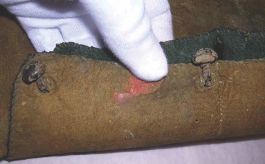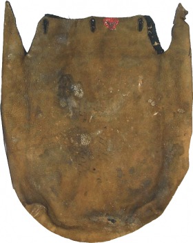 The Bag is made of once-soft leather with a green cloth or felt lining stitched within. At the open end there are three button holes and two out of three woven leather ‘cardigan’ buttons that would have attached the two sides of the opening with the button flap folded under the other (Figure 4). That leaves two narrow openings at the top of the Bag, adjacent to the corner ‘horns’. On the neck of Bag there is a cracked wax seal the remains of which depict the sun with a serious face above a torse (the twisted cloth wreath that surmounts a helm). The badge of clan Kerr features such an emblem encircled by the cheerful, self-satirising motto Sero Sed Serio (Late, but in earnest). There is also some faded, almost illegible text written on one side of the Bag that, according to my notes taken when I was examining the real thing rather than my photos, includes the name MacKenzie. So far, no Kerr or MacKenzie connections have emerged.