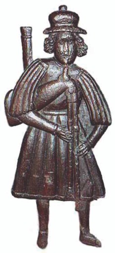 There is another early bagpipe case that isn’t just a box: the controversial stoppered tube seen behind the right shoulder of the bagpiper in a bench carving of around 1525 in St Nonna’s church, at Altarnun, Cornwall (Figure right). Some say it’s a drone. I disagree. Unlike a complicated Union Bagpipe complete with bellows, Altarnun man’s mouth-blown, droneless, two-parallel-chantered instrument would have rolled up neatly to be slipped into this narrow cylinder. This we do today. A gentleman once appeared at a bagpipe society meeting in West Yorkshire – nobody knew who he was or was expecting him – having brought with him a car-load of stitched leather WW2 gun sight cases for sale, which several of us gratefully bought for £15 apiece. They made perfect bagpipe (and shawm) holders almost identical to the ancient Altarnun example. Then the Jessops’ photography tripod case was discovered, that fulfilled the same function but with much less weight. Modern players of early bagpipes, including myself, keep and carry our instrument thus (figure left), fully assembled for immediate use and poking out of the top of the tube, strap slung over a shoulder.