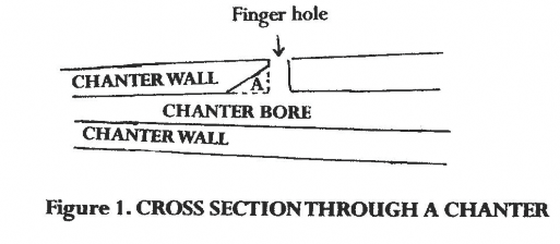 However there are two less radical ways which achieve the effect of shortening the column of vibrating air, thus raising the pitch of a single note, achievable by any keen ‘hands on’ piper. One is to increase the diameter of the finger hole. The other technique is to undercut the hole. This involves removing a small piece of wood on the inside of the upper side of the finger hole. (A on Fig 1). It does not affect the outward appearance of the chanter, it is reversible, and I have designed a nifty little tool for this very purpose.