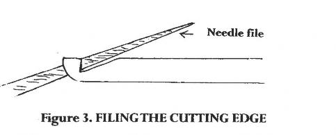 Even though they are made from hard spring steel it is still possible to file them with fine needle files. To start with you need to remove a triangle (B on Fig 2). when viewed from the side. Then round off some f the back heel (C on Fig 2). You should end up with something that resembles a tubular crochet hook. Now you can get a fine round needle file through the end and file the edge (Fig 2). from inside, so that the bevel of the knife edge is on the inside. Fine honing can be done with a small rolled- up screw of the finest wet and dry paper; mine hardly ever need re- sharpening.