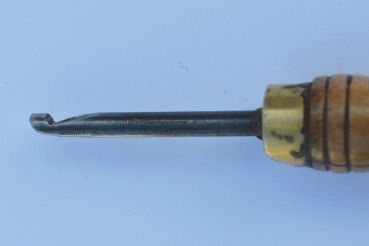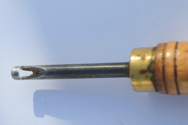 Undercutting appears simple, but in practice there remains the problem of swiftly, accurately and neatly removing a small piece of wood at the bottom of the finger hole without damaging its outside appearance. It is especially tricky on my narrow bored Leicestershire smallpipe chanter which has very small finger holes that leave little room to manoeuvre. I experimented with various knives for carving and also tried files and a Dremel drill, but all were hard to use, inefficient and could easily scuff or damage the visible outside of the fingerhole. Eventually I developed a simple cutting knife shaped somewhat like a crochet hook, which is easy to use, since you put it into the finger hole and pull it towards you at an angle. You can then accurately control how much wood to remove without damaging the surface diameter of the finger hole. I find it an invaluable tool and for reasons that I explain later I have immodestly named it ‘Goodacre’s Razor’.
