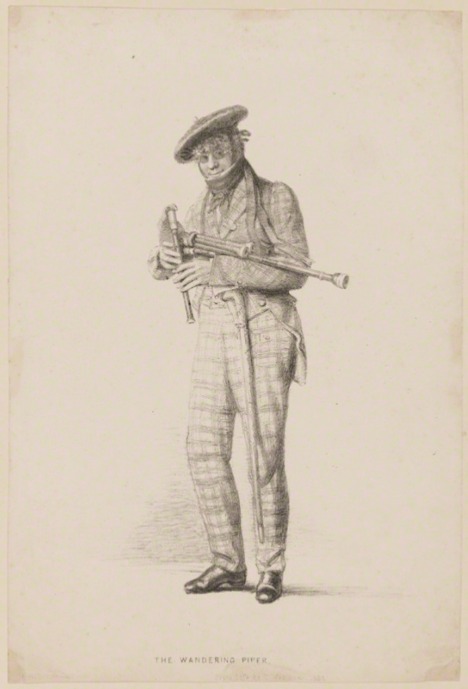 Though the wandering piper played what we often call border pipes today, the fact that some of his clothing was tartan seems to have suggested to people that he was representing the Highland tradition as the detail at the end of this extract from the Windsor and Eton Express of 16th December 1837 shows; “The Wandering Piper will perform on the ancient instruments of Caledonia and Hibernia &c on Monday evening next December 18th, from seven to nine o’clock at the Town Hall. The piper has, in his wanderings in the United Kingdom and the States of North America, appropriated 3,183l to Charity. He still wishes to continue the same system, when the receipts of the performance will admit of it, but he wishes the public to understand that such donations must be entirely voluntary. When the audience is such to enable the Piper to bestow his gains on Charitable Institutions, the appropriation will be at their disposal, or that of the Chief Magistrate, as the case may be. Printed addresses explanatory of the arduous undertaking, containing a list of the sums already applied to benevolent purposes may be seen at the Booksellers, and also at the Town Hall, from 12 to 2 p.m. on Monday. The Piper always performs in the splendid dress of a Highland Chieftain. Admittance one shilling each, Children under ten years of age, half price when accompanied by their parents.”
