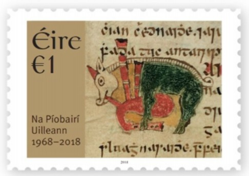 *On May 24, 2018, the Ireland Postal service, An Post, issued a new stamp. The new stamp celebrates the 50th anniversary of the Uilleann Pipers. An Post unveiled the stamp to celebrating that historic moment 50 years ago. When Na Píobairí Uilleann was founded there were less than 100 pipers remaining in the world. Today, operating from Dublin’s Henrietta Street, they are one of Ireland’s leading cultural organisations and maintain contact with thousands of pipers from around the world. In 2017 the uilleann pipes were recognised by UNESCO as an ‘Intangible Cultural Heritage of Humanity’. This important global accolade reflects heritage and cultural practices that are considered to enrich all of humanity. Stamp designed by Vermillion Design. The stamp features the earliest known image of uillean pipes, ‘a piping pig’ as the capital letter ‘M’ from a 16th century Irish manuscript featured in Edward Bunting’s 1840 collection ‘The Ancient Music of Ireland. *
