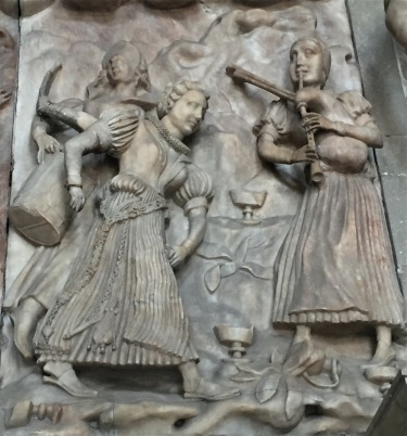 So, is this an English bagpipe? Probably not - but she is definitely an English bagpiper. Whilst the print is Flemish and the design of the bagpipe reflects the forward facing drones of a Flemish bagpipe, the player’s clothing has definitely been adapted from that shown in the print to reflect an English style of dress. The coif (headdress) and sleeve design are English not Dutch, as is the pleating on the kirtle (skirt). The carver has adapted the costume to reflect English tastes and who can say for sure whether or not that type of bagpipe was played in England? There were considerable trade and cultural links with Flanders throughout the 16th century, especially along the east coast, and there’s every reason to suppose that musicians and their instruments also found their way from the continent to England. So tt is not beyond the realms of possibility that a Flemish style bagpipe was played in England.