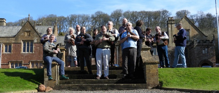 Fourteen of us got together to play Säckpipa in the deepest depths of ‘sleepy’ Somerset. There were 12 workshop participants, one who had travelled from Belgium, the rest from all over the UK. This first weekend for the Säckpipa was led by the talented multi-instrumentalists Vicki Swan and Jonny Dyer. Four were relative beginners, mainly working with Jonny in the library, while the more experienced players were led by Vicki in the Long Room. We also shared the weekend at Halsway Manor with melodeon makers learning from Emmanuel Pariselle.