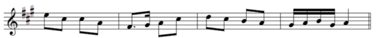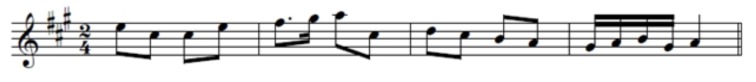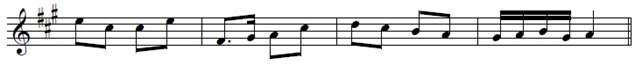The problem with this tune is the c#’ in the first bar as it’s not playable on Swedish pipes (you remember, the lowest note is d’). In order to keep as much of the original tune as possible I decided against changing the complete first bar by using an inversion of the triad and went for only changing the low c#’. Possible replacements for the low c#’ would be: e’, a’, c#’’ or e’’. Which one to choose becomes easy if you have a closer look to the melody structure of both bars as a unit. In both bars the first three notes are a line downwards, the following notes a line upwards. The goal is to keep this structure as good as possible. Because a’, c#’’ and e’’ would create a jump, the only option is to play another ‘e’ instead of the ‘c#’’.