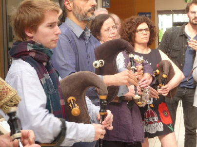 Patrick Blanc showing how the musette can work with percussion to address a 16th and 17th century repertoire. Amanda Babington played a piece of Niel Gow’s music on musette at the end of her lecture, and there was a lunchtime concert joining flute (Camille Breger) and musette (Merryl Luchart), an unexpected but excellent combination. Coffee and lunch breaks became mini-sessions, and there were mass play-throughs with a good-sized musette orchestra