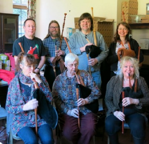 The Farmer’s Daughter is a simple waltz used as a teaching tune from the Limousine, the German tune is a round that can be played in either G mixolydian or G minor, Le garçon jardinier introduces Bb and the Galician gig is good for scales and gracing! We also spent some time trying out the Bagpipe Society’s Small pipes. At the start of the course we made a list of outcomes and targets that the students wanted to achieve, mostly were to do with having a go and getting better! We achieved what we set out to do and everyone seemed to go away happy. Three people said they would now like to buy some pipes and two would like to come to the Blowout.