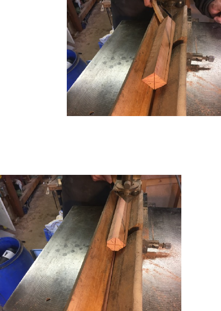 For many years our method for doing this was to hold the diagonal of the square billet perpendicular to the table of the bandsaw, a piece of wood cut to a right-angle triangle would be held under one face of the billet in order to maintain this angle. The adjustable steel fence, which sits on the far side of the blade would then be set by eye to determine the width of the cut which would best result in an octagon. This is best understood by looking at Fig 1 - 3 As you can see there are a lot of fingers and thumbs involved in holding this rather unstable arrangement together, not least because the downward force of the moving bandsaw blade wants to rotate the billet clockwise (from the observer’s perspective) away from the triangular supporting piece. This rotational force most often expresses itself by the blade grabbing the billet very suddenly, if you have a loose grip on the billet its more likely to happen and it’ll be taken from your hand with a loud bang. The tendency is to keep a firmer grip on the piece, the downside of which is that if you’re still unlucky enough to fall victim to this mischievous force then your hand will move with the billet, in the direction of the blade. Then if you imagine the billet we are working with is going to become a blow pipe stock, with starting dimensions of only 65mm in length by 35mm square and you are working with your hands very close to the blade, you can begin to appreciate how dangerous this method is. In fact, putting this in writing I can’t believe we actually did this for so many years. Obviously the first cut is the worst because the billet is resting on one of its corners, once you’re onto the second cut you at least have a narrow flat face resting on the table, but its still far from fool proof.