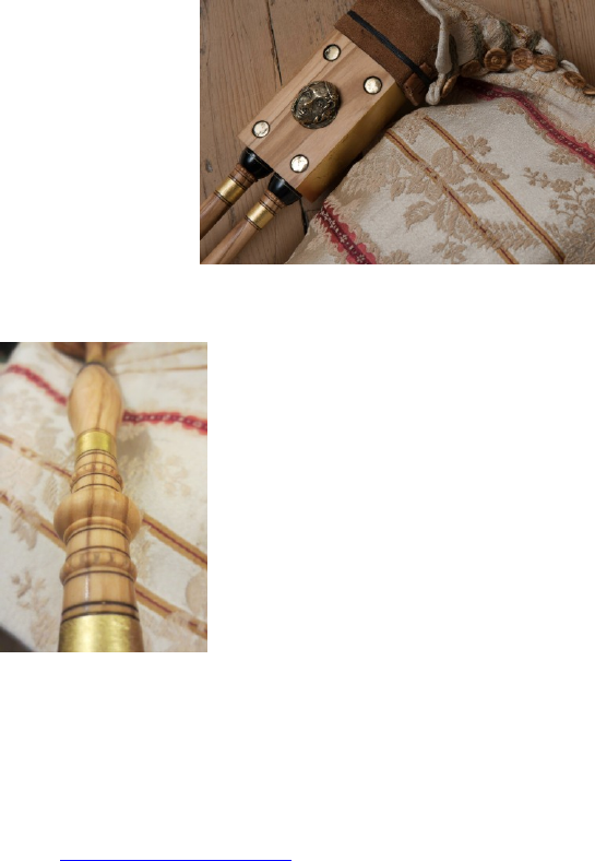 ’traditional’ way, I decided to limit the use of plastics, so the drone reeds are made from boxwood and bronze. The bag is hand-stitched and covered with an antique fabric, buttons which turned in the same wood as the instrument, plus some bits of embroidery.