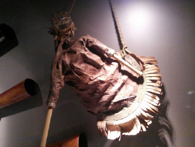 About nine-tenths of the instruments displayed are strings, whether plucked (dombra) or bowed (kobyz)m as well as harps and zithers. However, there are some interesting wind instruments too. The ocarina is a popular folk instrument in both Kazakhstsn and Kyrgyzstan, which share a similar nomadic culture; various types of flutes and whistles are found, as are long wooden ’trumpets’. Overtone flutes appear to be common, as is the jaws harp; many of the flutes have only three or four fingerholes. There are also a couple of what appear to be versions of pibgorn. In the wing devoted to instruments from other countries, I was surprised to find a number of bagpipes, including a couple of East European bagpipes and a veuze which appears to have had the drone replaced by a biniou koz chanter. (That may well indicate that no one among the staff actually knows how bagpipes are intended to function.)