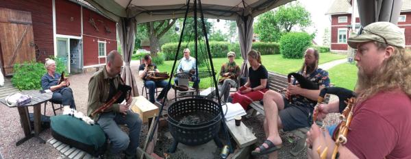 This year, the weekend after midsummer, I attended for the first time the annual meeting of Swedish Bagpipe (Säckpipa) Players. The meeting is an informal gathering at the home and B&B of the hosts, Hans and Gun Rönnegård, , in the small town of Gagnef, set in the beautiful countryside of Dalarna. I arrived there on the Friday afternoon and having received a very warm welcome from Hans and Gun, I very quickly got talking to the other people who had already arrived. I was shown my accommodation, a loft room (Loftet), which housed five people. There was a large wooden table in the middle, covered in Bagpipes made by Börs Anders Öhman, who let me try some of them. He also brought some very nice whiskey to share. Throughout the rest of the evening, other attendees arrived, some I’d met, some I hadn’t, and some I’d only met online prior! It wasn’t long until there was music. The setting lent itself to small circles of pipers forming and naturally one musician will start a tune, and if it’s well known, everyone else will start playing along!