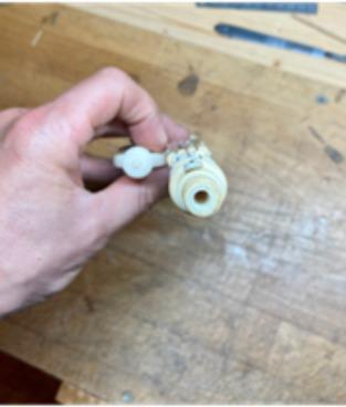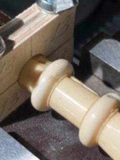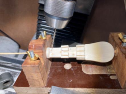 On this instrument, someone had enlarged a section of the bore to a 6mm diameter. I turned a new piece of ivory with a 3.3mm pilot hole, and glued it in the chanter. The next day I drilled again with a 3.8mm gun drill and reamed with a conical reamer made from a steel rod.