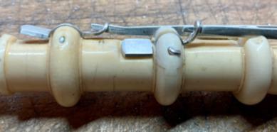 In 2017, a fourth musette à ravalement showed up for sale, at an auction in Vichy. It was badly damaged and incomplete, only a part of the grand chalumeau survived. All of the keys and the bell were missing, the bore had been enlarged and 4 key blocks were ripped off. Perhaps by someone who wanted to melt down the silver keys.