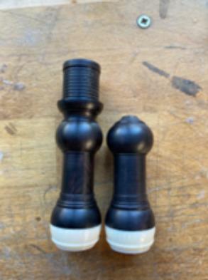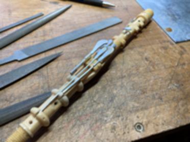 With what remained of the original chanter now restored, I could start with making the missing parts to complete the instrument. The bell and main stock (boîtier du grand chalumeau) are screwed onto the old chalumeau. For this, we ordered an exact copy in metal of the existing screw threads, which I then milled to use as a tap to make the internal screw thread on the new parts.