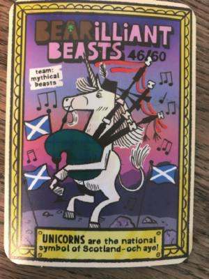I thought you might appreciate this image of a bagpipe-playing unicorn. It comes from collectible cards in a popular children’s fruit-leather snack (doubtless others are available). I can’t help but wonder if this is the first ever image of a bagpipe-playing unicorn or if others are out there awaiting discovery?