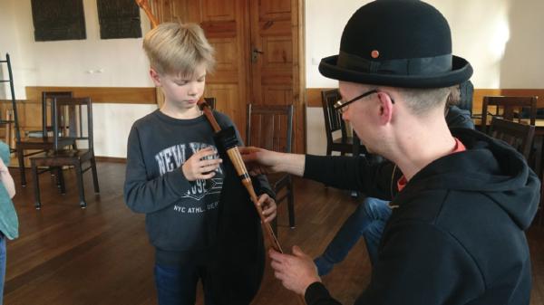 Branschke, an experienced piper, composer and instrument maker from Northern Germany. He not only taught traditional music from a piper’s perspective to three ensemble groups of 10 people, he also introduced kids, teens and grown-ups to the bagpipe and provided them with a chance to try out the instrument.